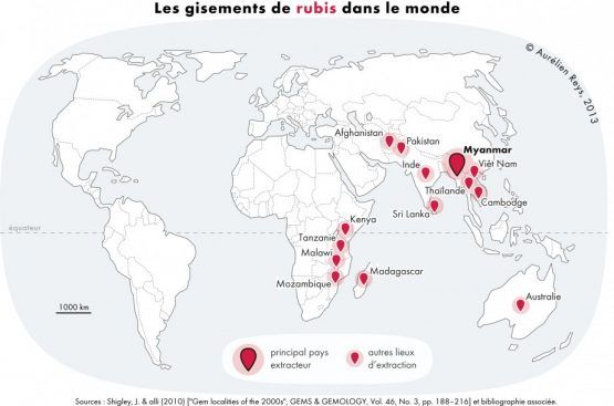 La couleur la plus désirable est dite « sang de pigeon », un rouge pur avec une touche de bleu, seulement trouvé dans les mines du Myanmar (Birmanie), les gisements de rubis les plus importants connus.