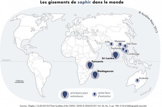Les saphirs Sri-lankais et de Madagascar sont les plus répandus de nos jours, avec une large gamme de couleurs allant du bleu ciel clair au bleu foncé.