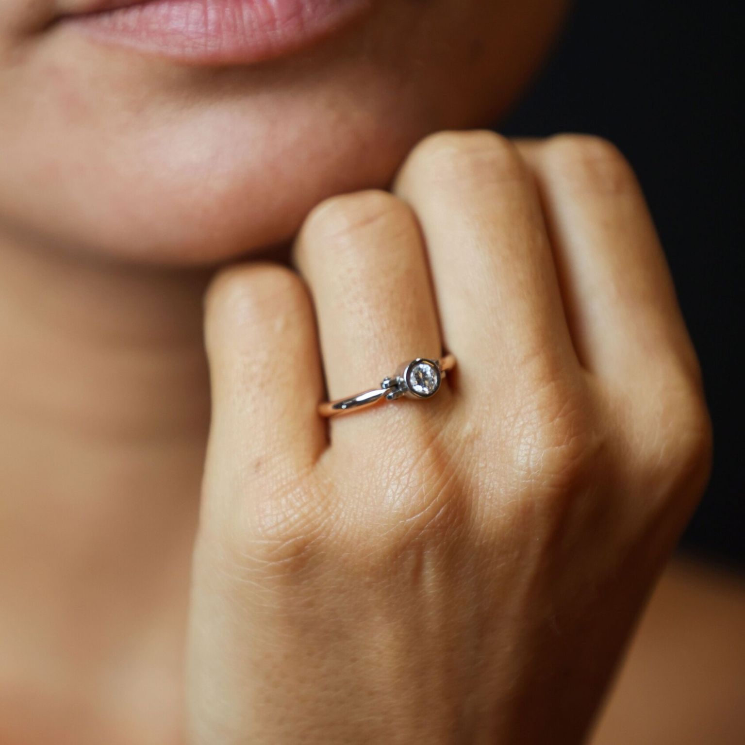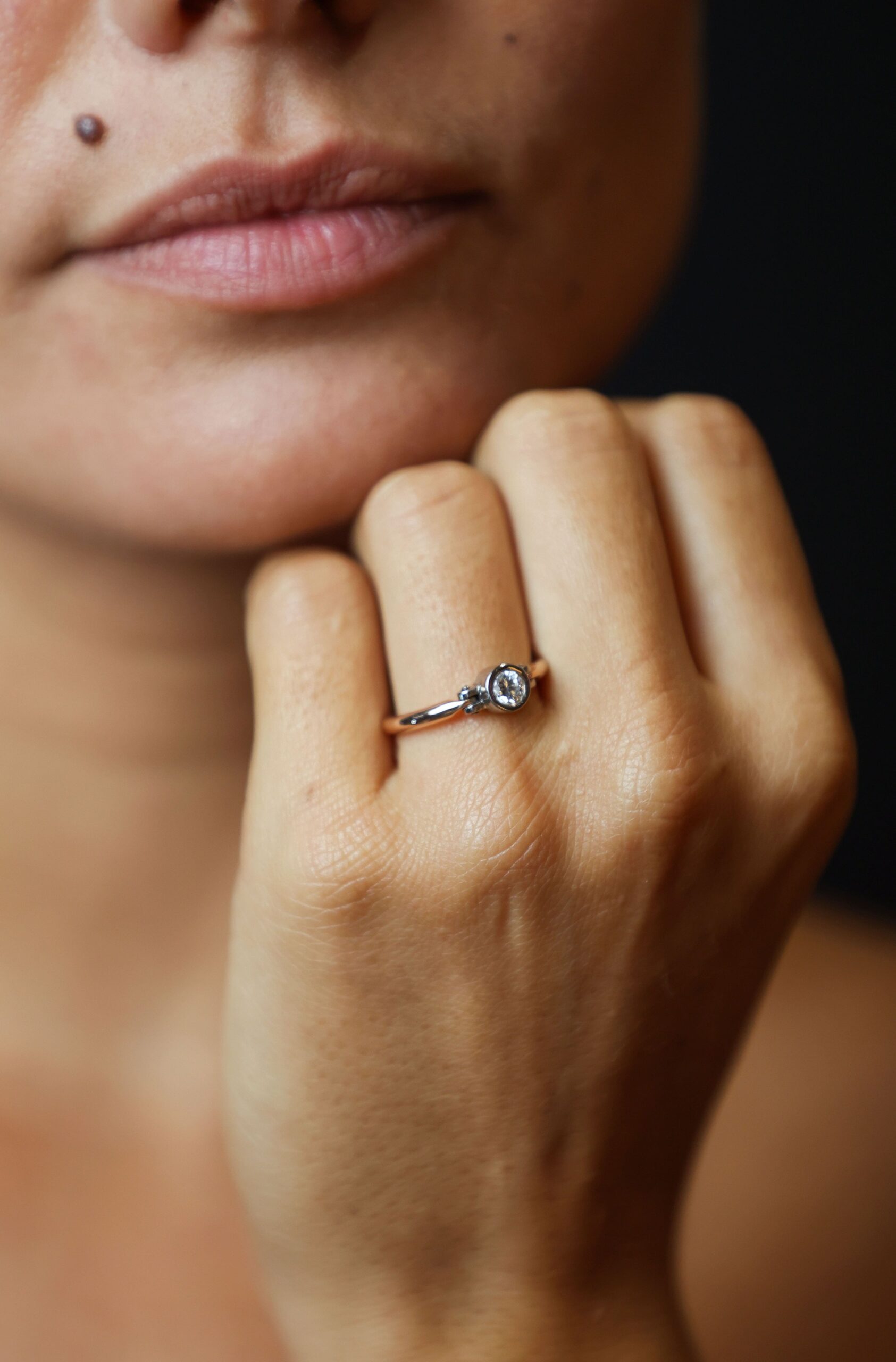 Façonnée en or champagne et or gris 750 millièmes, la bague Constellation se distingue par sa ligne épurée et son éclat vibrant. Ses cinq diamants DF-VS2, d’un poids total de 0,25 ct, sont sertis clos avec une précision d’artisan, évoquant une voûte céleste posée sur la peau. Chaque pierre scintille comme un point de lumière dans la nuit, symbole de nos rêves et de nos possibles.