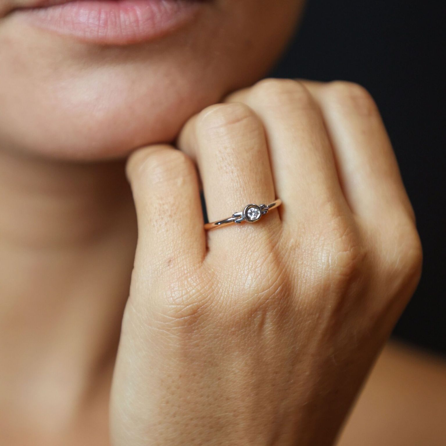 Façonnée en or champagne et or gris 750 millièmes, la bague Constellation se distingue par sa ligne épurée et son éclat vibrant. Ses cinq diamants DF-VS2, d’un poids total de 0,09 ct, sont sertis clos avec une précision d’artisan, évoquant une voûte céleste posée sur la peau. Chaque pierre scintille comme un point de lumière dans la nuit, symbole de nos rêves et de nos possibles.