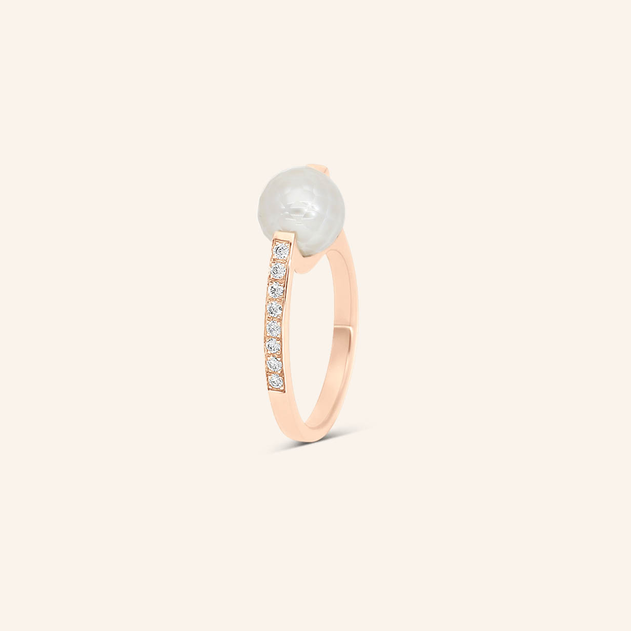 Façonnée en or rouge 750 millièmes, cette création est ornée d’une perle Hanshinju au lustre délicat, symbole de pureté et de calme intérieur. Une ligne de diamants taille brillant vient souligner sa finesse et apporter une touche de lumière subtile. Diamants DF-VS2 d’un poids total d’environ 0,014 ct. Perle d’Akoya façettée de 8 à 8,5 mm de diamètre. Taille de doigt métrique : toute taille sur commande.