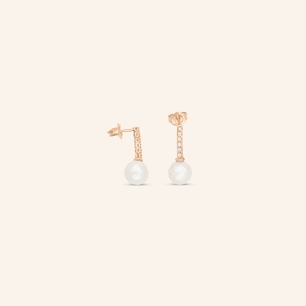 Façonnées en or rouge 750 millièmes, ces créations sont ornées de perles Hanshinju au lustre délicat, symboles de pureté et de calme intérieur. Une ligne de diamants taille brillant vient souligner leur finesse et apporter une touche de lumière subtile. Diamants DF-VS2 d’un poids total d’environ 0,030 ct. Deux perles d’Akoya façettées de 9 à 9,5 mm de diamètre.